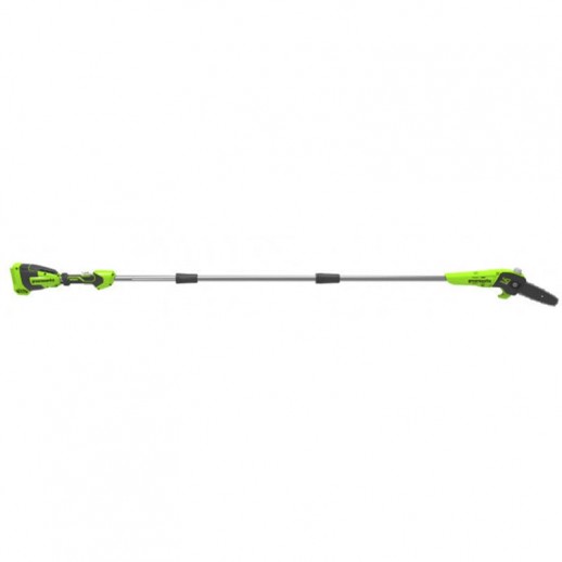 Высоторез (сучкорез) аккумуляторный Greenworks серии 40 вольт (модель G40PSF) с легкостью справиться с обрезкой ветвей и сучьев на высоте до 4-х метров. Основное преимущество этой модели - 3-х секционная штанга, максимальная длина которой - 203 см. Высоторез оснащена 20 см. шиной из кремнистой стали и цепью производства компании Oregon. Довольно лёгкий вес (всего 3,7 кг.) для устройств этого класса и назначения, а также низкий уровень шума и вибрации. Удобство использования обеспечено эргономичной ручкой с упором для предплечья. Масляный бачок 80 мл для смазки цепи с прозрачным корпусом для удобства просмотра уровня масла. Долгое автономное время работы (до 30 минут от 4 А/ч батареи) и отсутствие необходимости использовать бензин. Экологически безопасный продукт как для вашего здоровья, так и для окружающей среды. Не требует обслуживания, замены свечей и т.п. Есть предохранитель от случайного включения, а для долговечной работы двигатель имеет защиту от перегрузки. Высоторез-сучкорез работает от аккумуляторной батареи G-MAX 40V, которую можно использовать с другими устройствами линейки 40V (на текущий момент 15+ устройств).